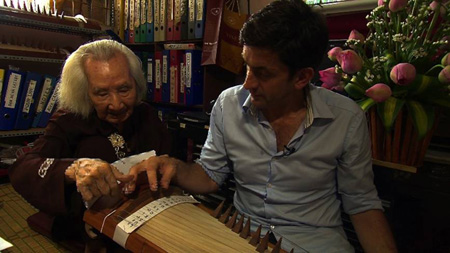 | Maestro Vinh Bao, 96 years old, teaching MC Justin Rowlatt how to play Dan Tranh (16-chord zither). |