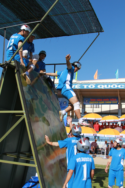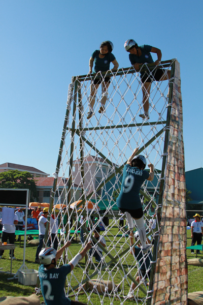 | To reach target, athletes have to assist each other to pass obstacles. |