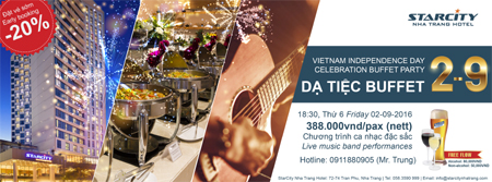 Delicious foods, luxurious space and special music programs are waiting for you at StarCity Nha Trang Hotel (Add: 72-74 Tran Phu Street, Nha Trang) for a cozy celebrating dinner with your beloved ones on the occasion of the National Day (September 2).
