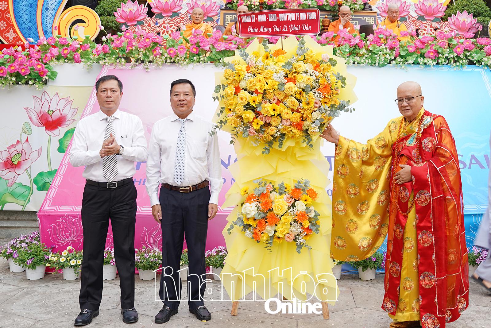 | Leaders of Nha Trang City People's Committee present greeting flowers to representatives of the Executive Committee of the provincial Buddhist Sangha. |