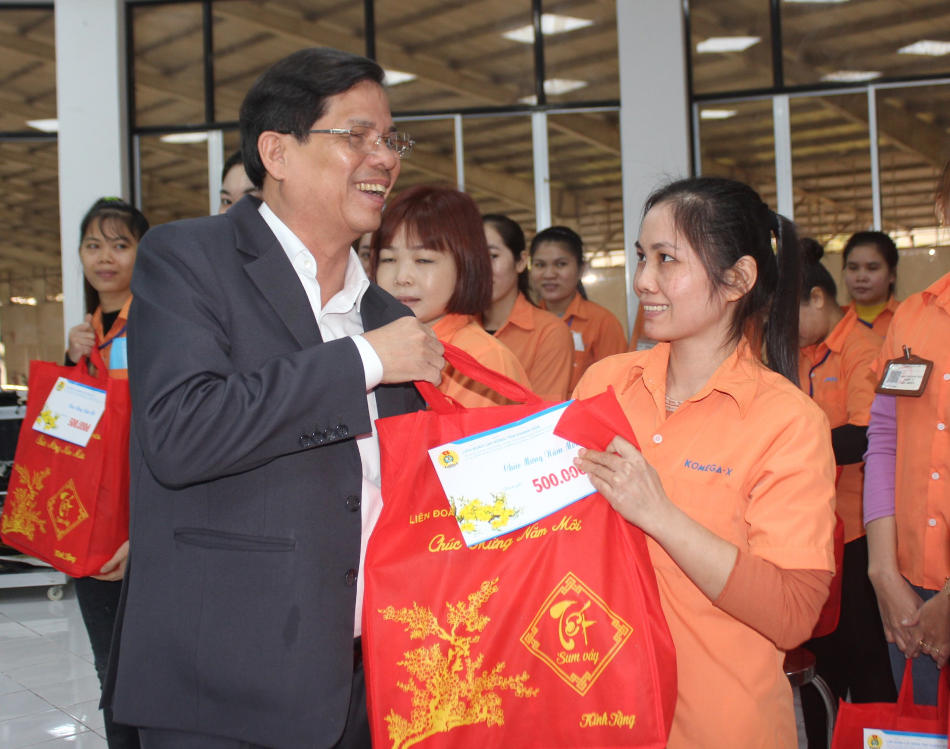 | Chairman of the Provincial People's Committee Nguyen Tan Tuan presents gifts to workers at Suoi Dau Industrial Park. |