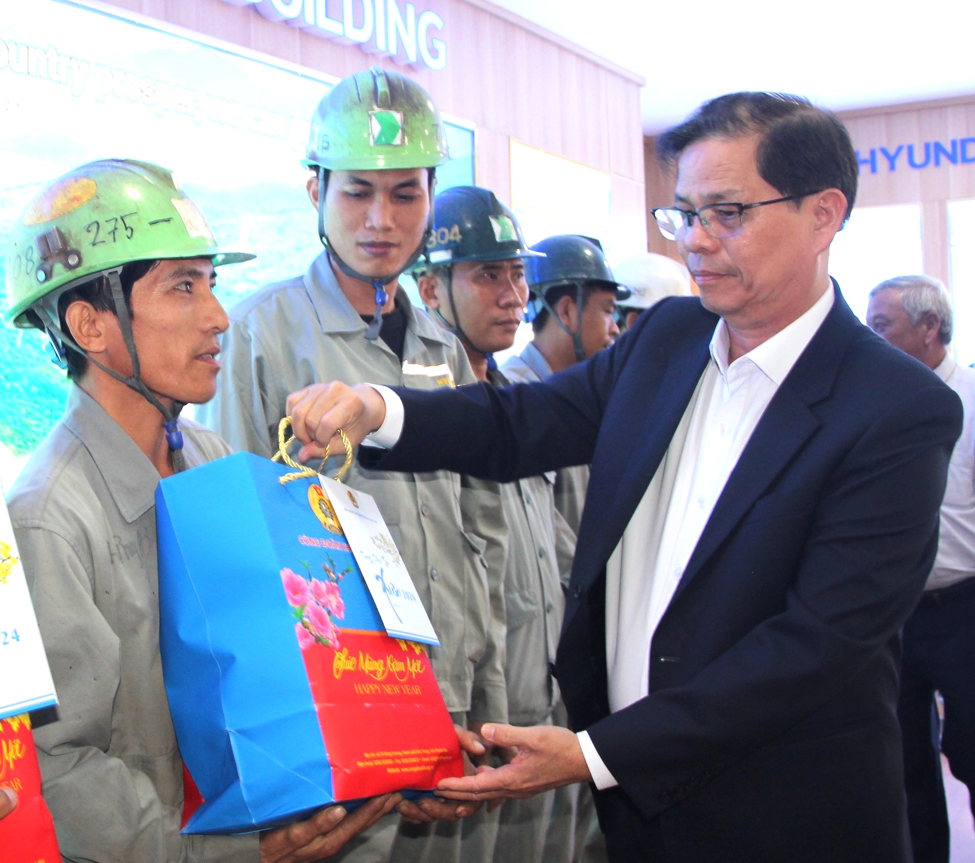 | Chairman of the Provincial People's Committee Nguyen Tan Tuan offers gifts to workers at HD Hyundai Vietnam Shipbuilding Co., Ltd. |