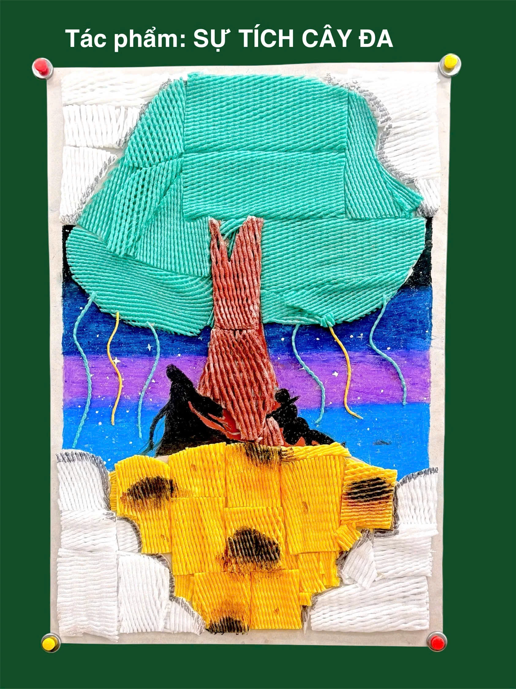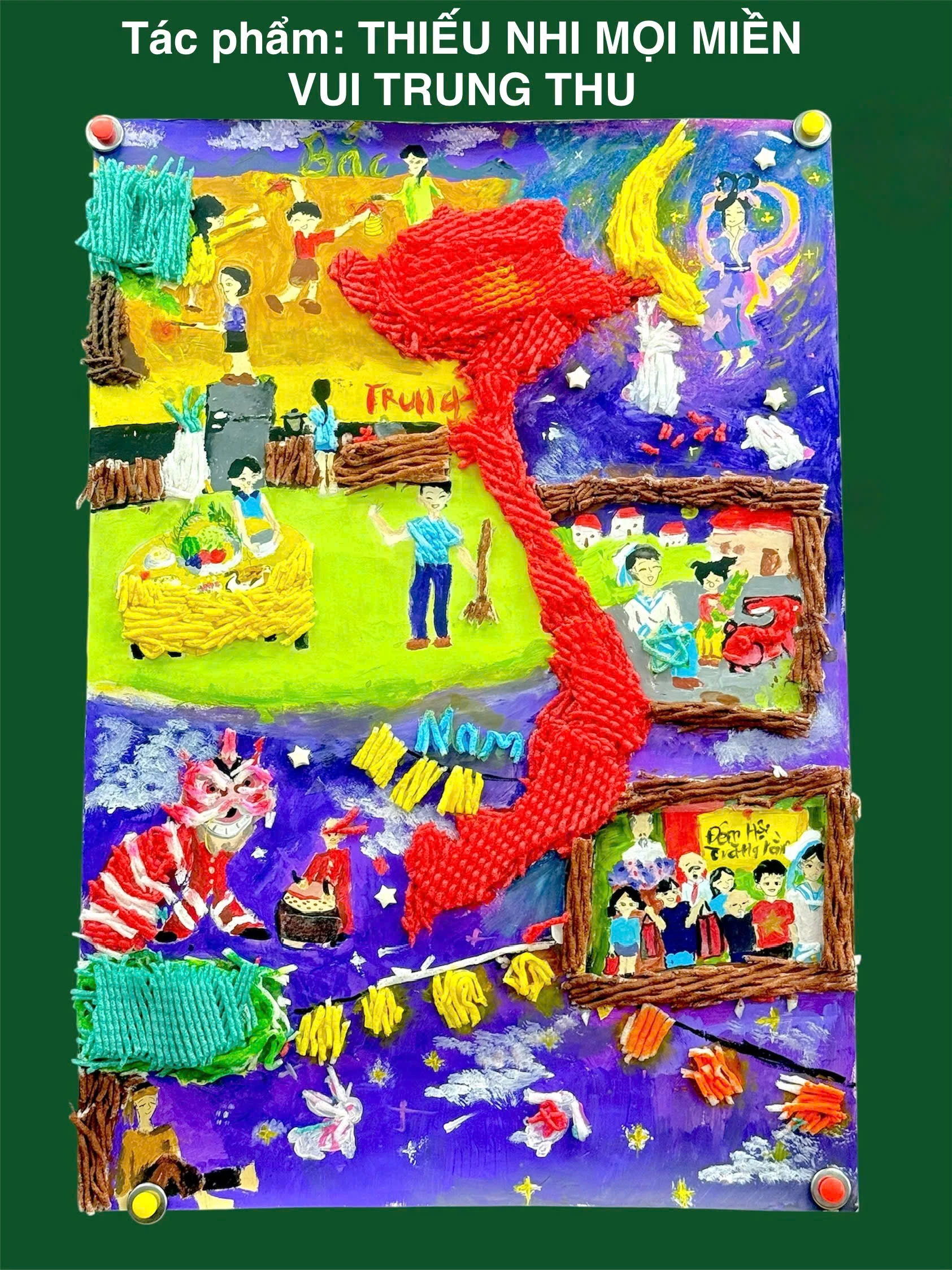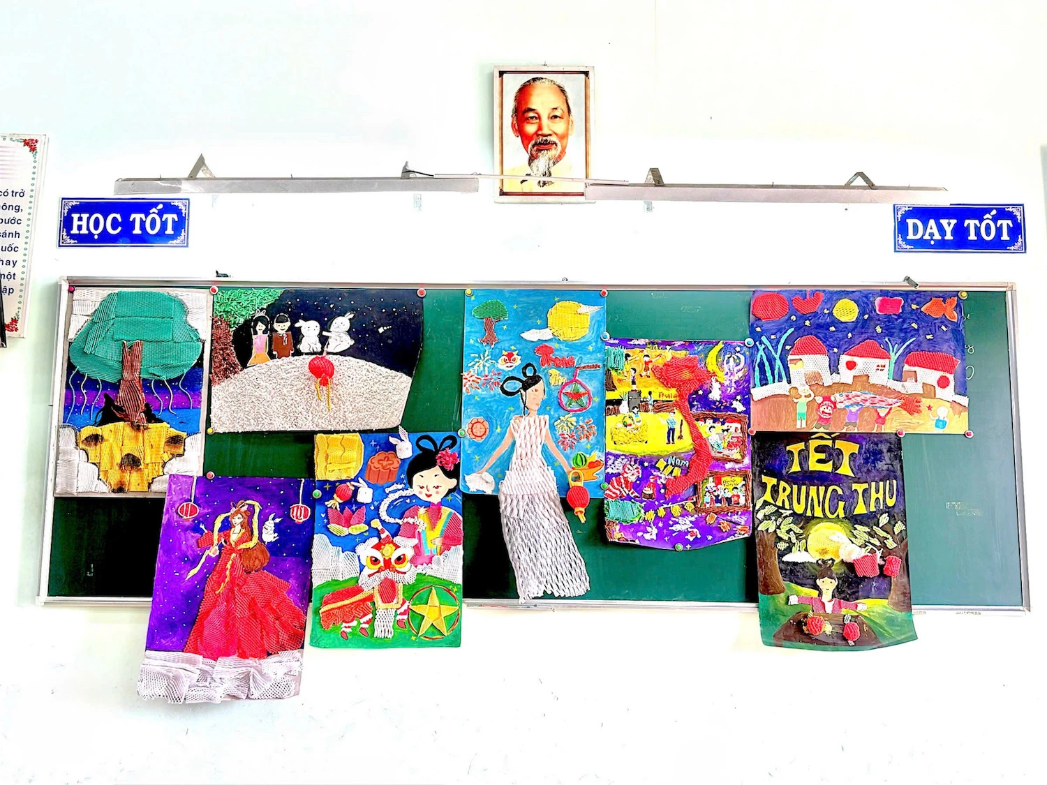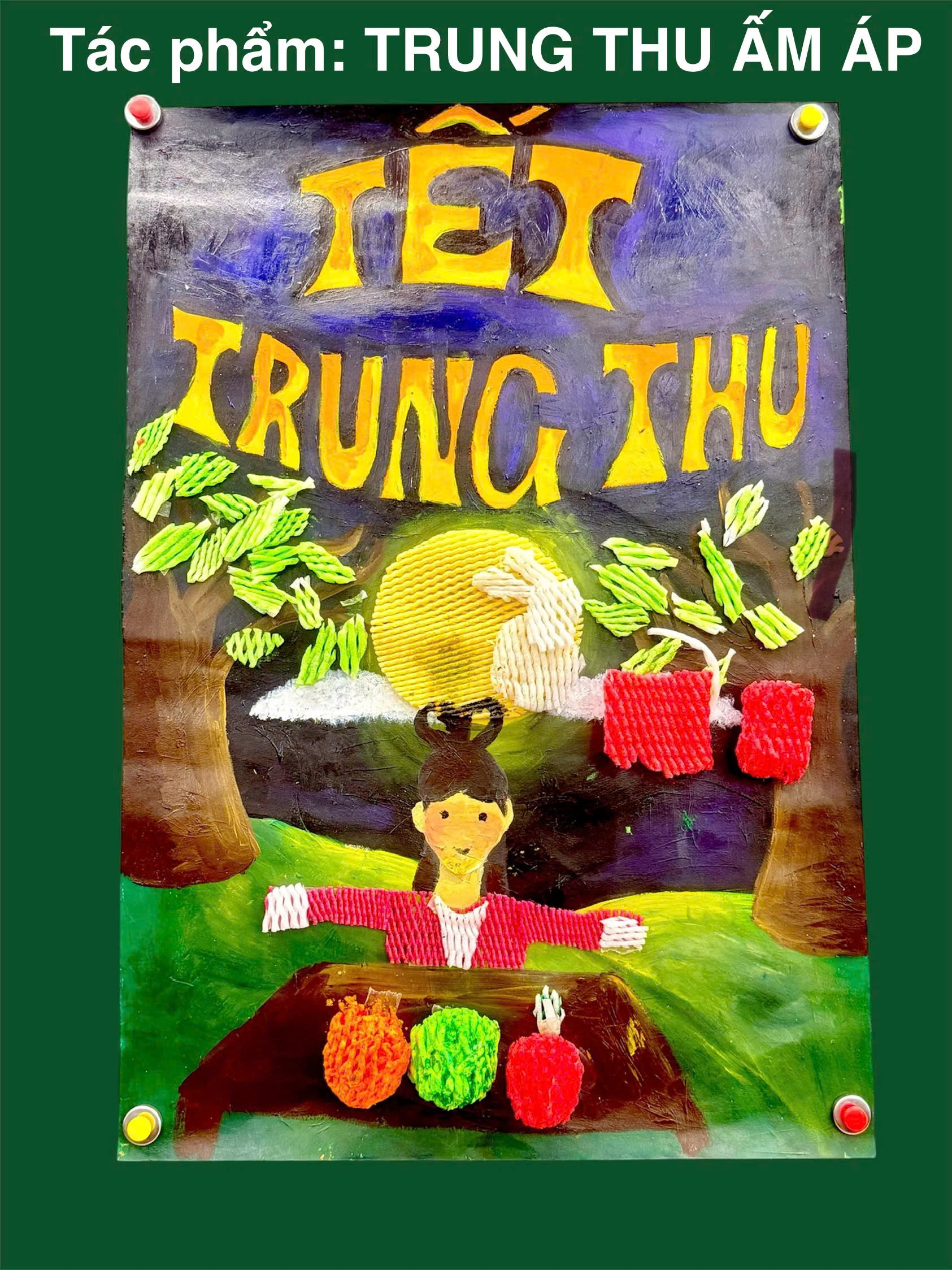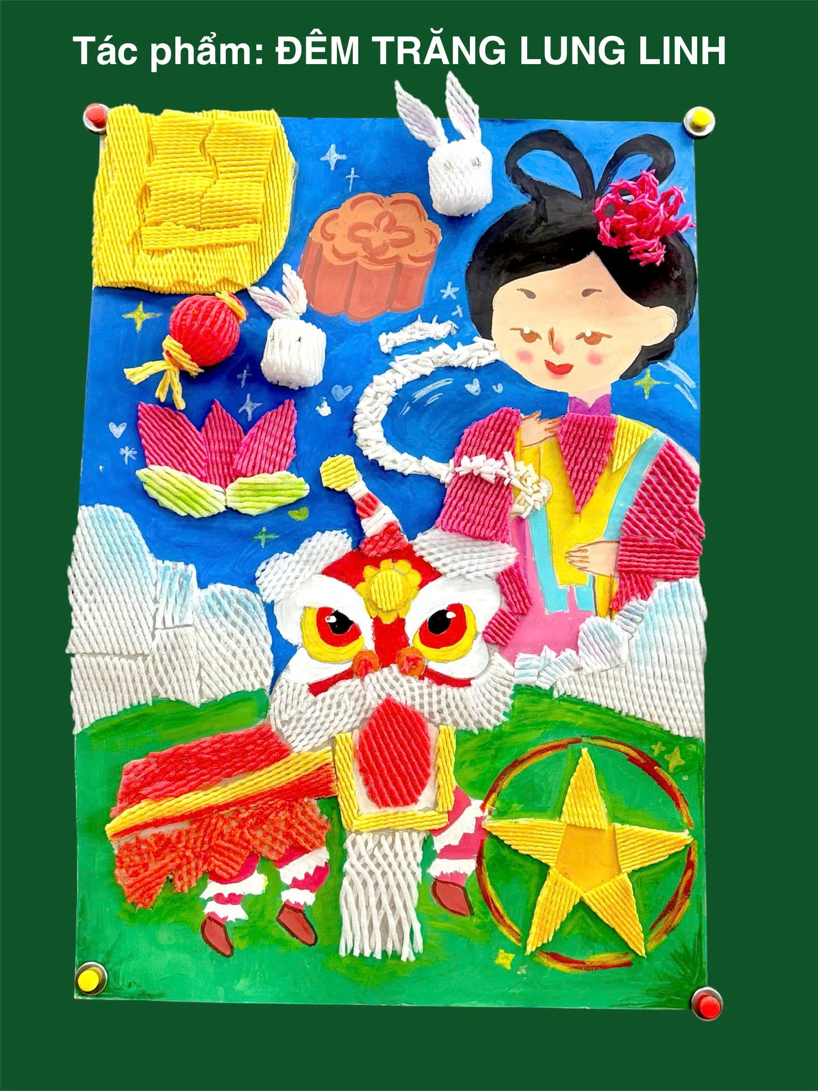 Teacher Le Thi Ai Van, class 8/1, guided her students through a week-long creative project that began with collecting used foam nets, washing, drying and coloring them; and then transforming them into art. The students, divided into eight teams showcased their rich imagination through vibrant artworks celebrating the Mid-Autumn Festival, featuring the Moon Lady, glowing lanterns, festive feasts, and scenes of joyful, loving families. Discarded foam nets have been transformed into colorful crafts thanks to the creativity of the students. They were very excited to make the artworks from this new material.