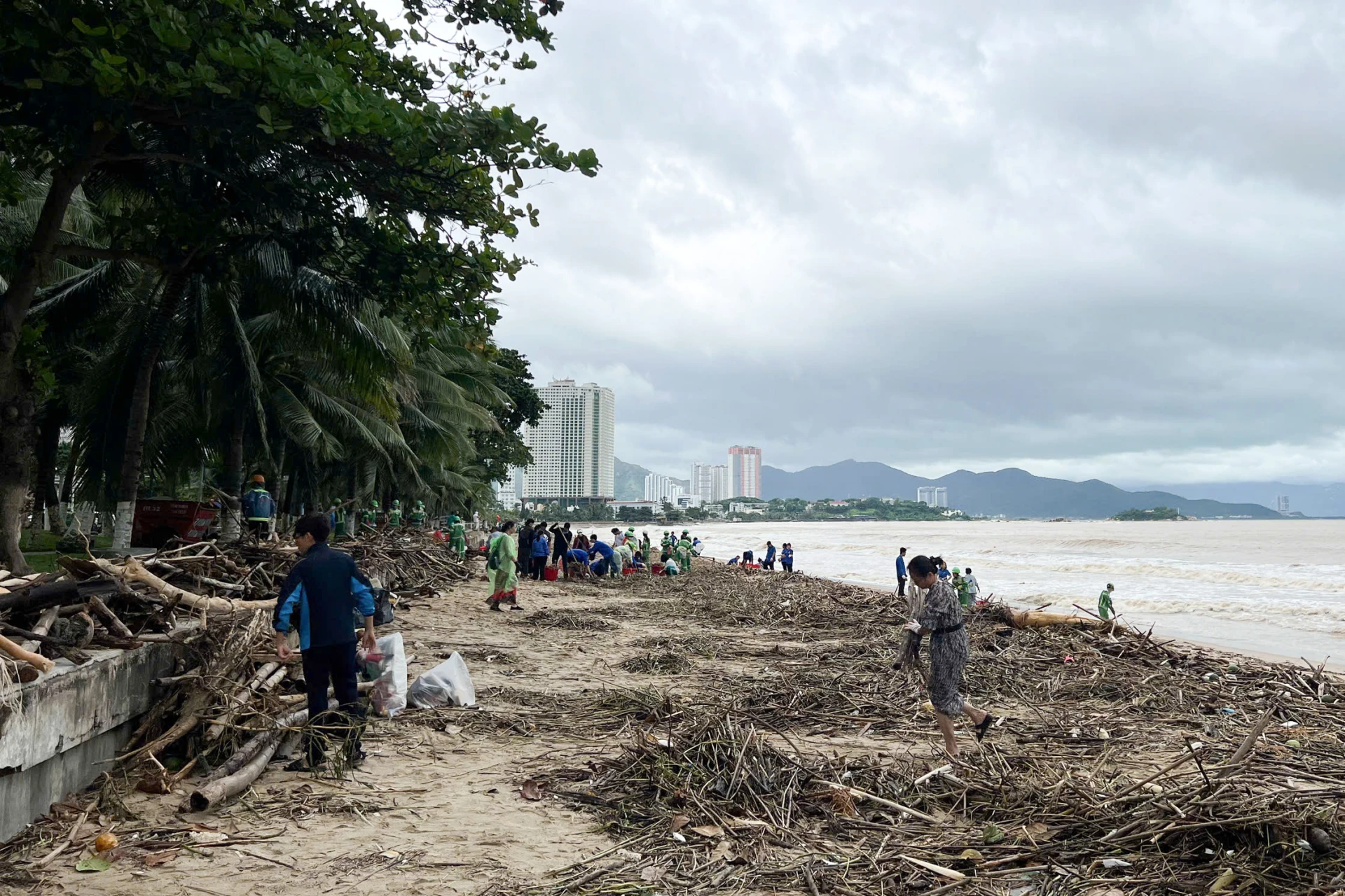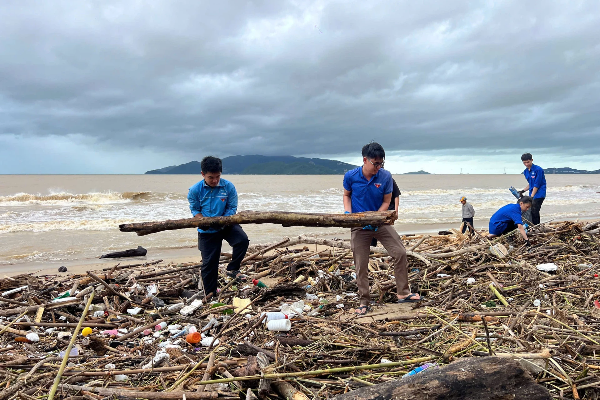 On November 22 morning, hundreds of Youth Union members, young people and students participate in Nha Trang beach clean-up after a major flood washed large amounts of trash ashore.