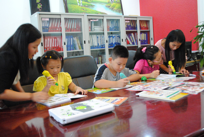 | TH Nha Trang Computer Company staff instruct children how to use easy-talk and smart - talk devices. |