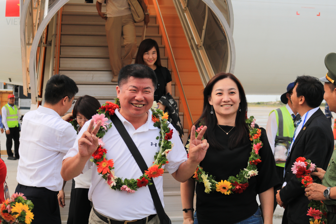 | Passengers from Uzbekistan are welcomed with flowers from the leader of Khanh Hoa Department of Tourism. |