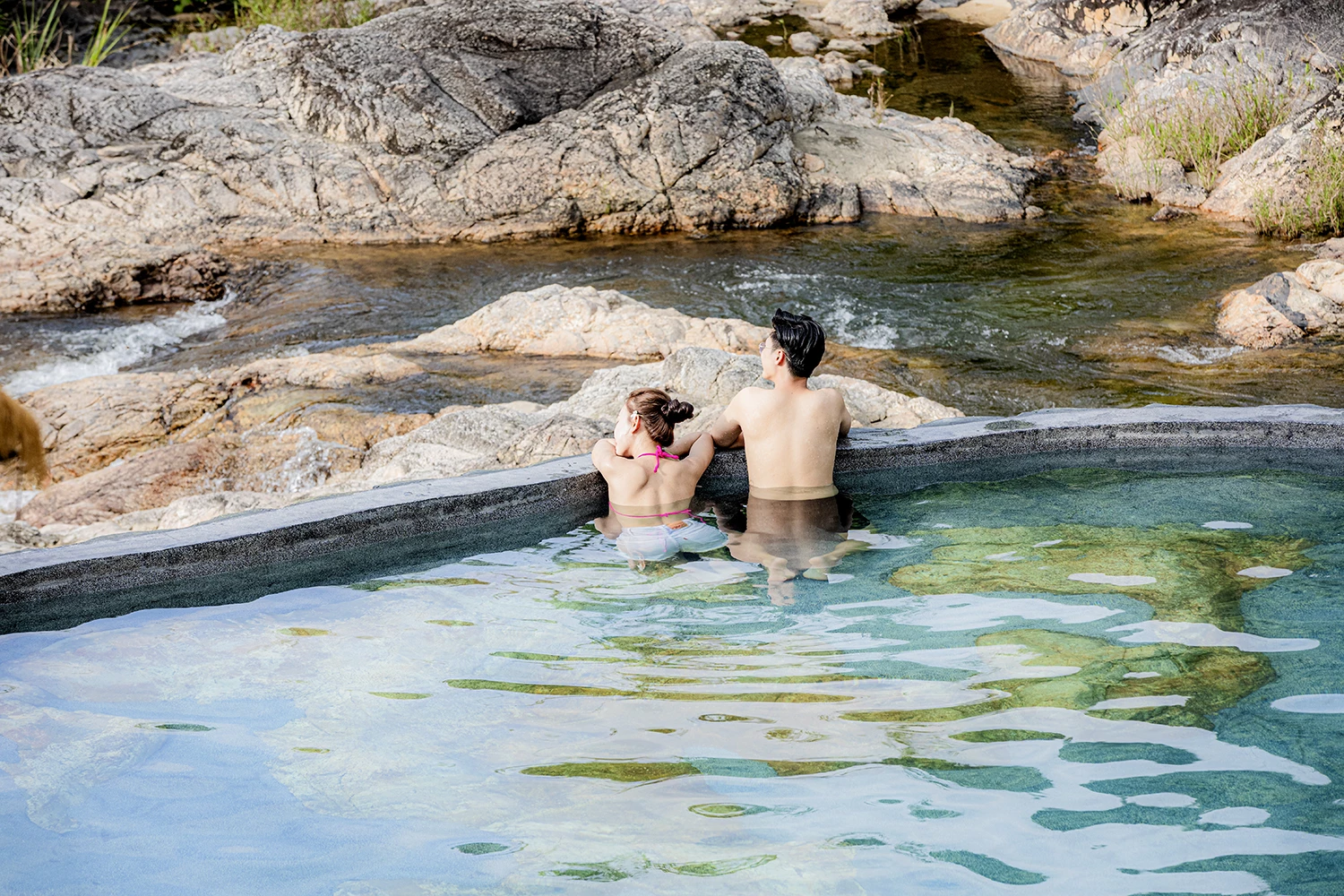 | Visitors relax in hot mineral water at Ho Cho waterfall. |